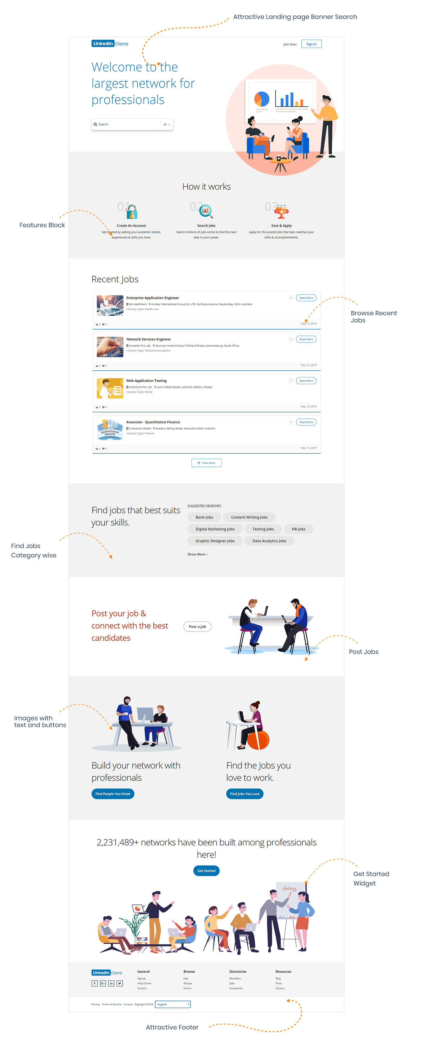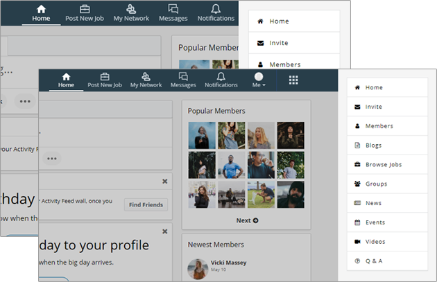 The very attractive and professional looking landing page of this theme is surely going to give a complete feel of Linkedin to your users that they might get confused for a while. Settings for every element placed on the Landing Page such as Image, heading text, description for the Banner, Landing Page Features, Categories, Member jobs etc. can be easily configured from the Widgets in Layout Editor.