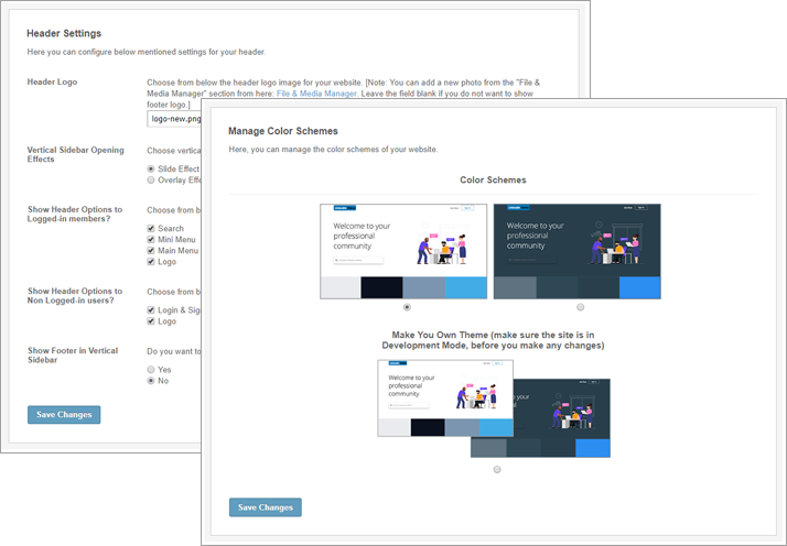 You can choose Header Logo, Vertical Sidebar Opening Effects, Header Options to Logged-in / Non Logged-in members, Footer in Vertical Sidebar from the Admin Panel which will enhance the header and make it look more professional.