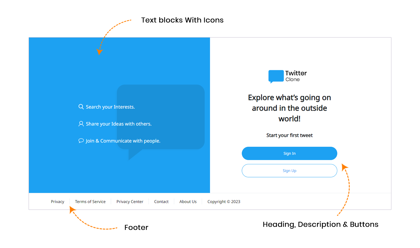 The Landing Page coming with theme is very attractive and will surely going to give a complete feel of Twitter to your users that they might get confused for a while. You can customize every possible setting for the landing page such as Logo, Text & Icons for the Text Blocks, Enable/Disable Login Fields, Heading & Description for Right Side of the Landing Page etc. from the Admin Panel of this Theme.