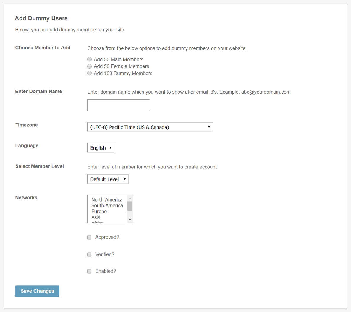 - This plugin facilitates you to create 100’s of Pre-configured Dummy users with the option of choosing Gender also. By entering the various fields and domain name ( common for all the members you want to show after email id’s. ), you can create dummy users in just few minutes.
