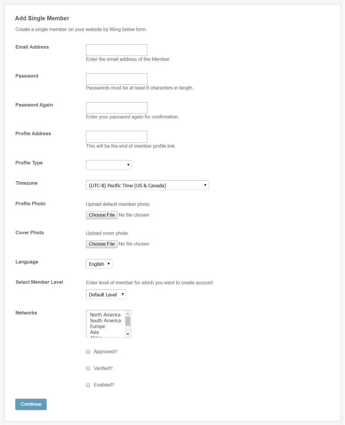 If you want to create a single user for your website then you can do that from this section very easily. All the fields which need to be filled up in the form are same just like the signup page of your website such as Email Address, Passwords, Profile Address, Profile Types, Time Zone, Profile Photo, Member Level, Networks etc.