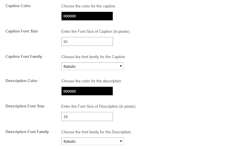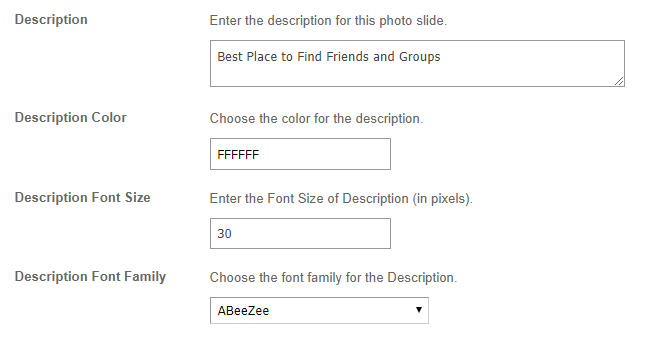 This plugin provides a Description option for each slide. You can use this setting to explain in brief about the slide to your users pr telling them the purpose for it has been made. For each Description, you can configure below settings: