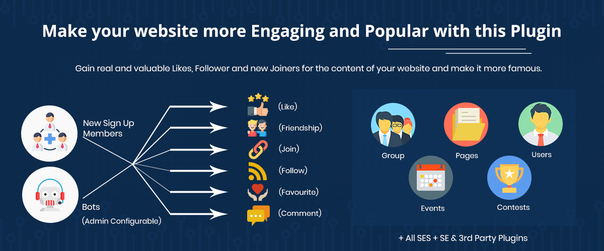 With this great feature of this plugin, Admin can add and manage numbers of site users as Bot who will perform auto actions (Like, Comment, Follow, Join, Favourite) on new content. These Bot users can be differently chosen for the different Bot actions and can perform actions on different members based on their member levels.