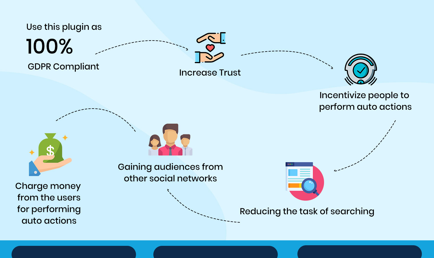 This plugin will not disclose any personal information or perform any action without the real consent of the users. You can create your own Bots and assign actions to be performed by them. You can take consent from your users and add them to the BOT list and pay them to perform auto actions on your website.