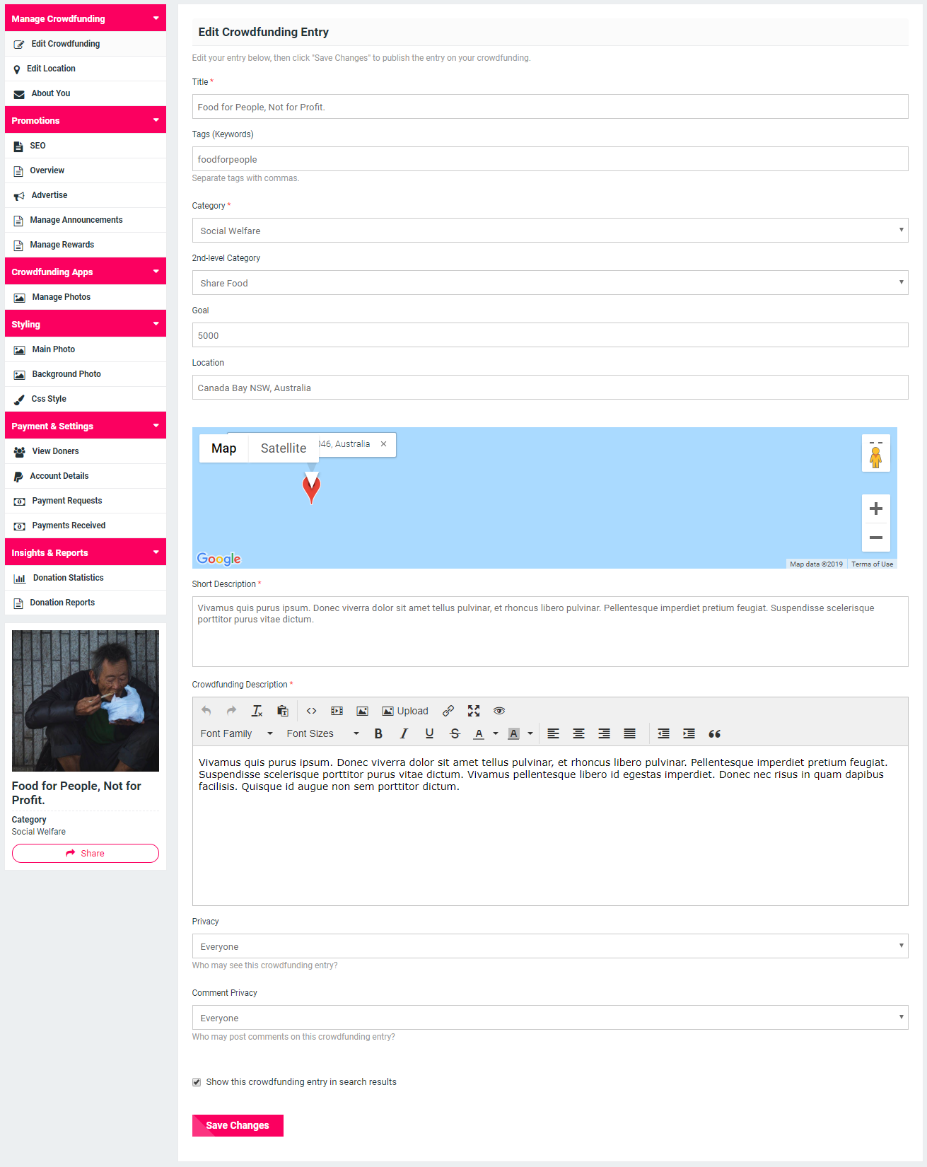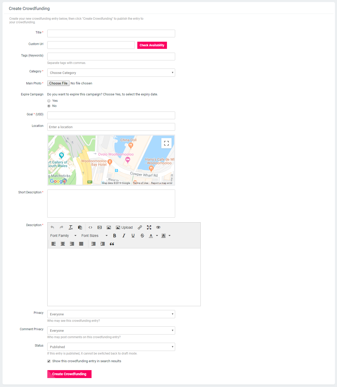 - Crowdfundings can have Google suggested Locations based on the settings configured from admin panel.