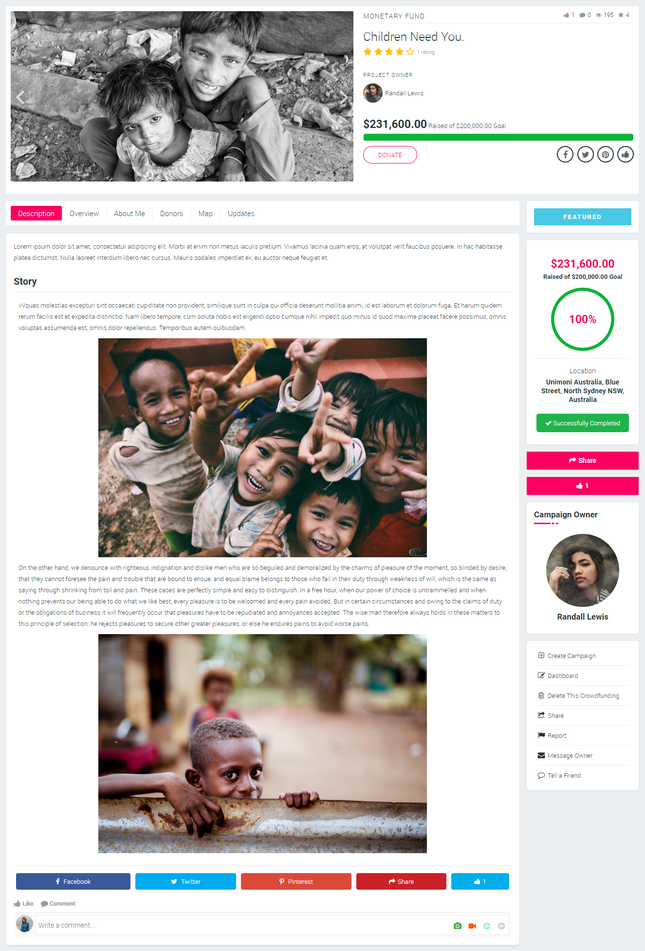 DescriptionThis section will display the idea and purpose behind the creation of crowdfunding by the fundraiser. Fundraisers can enter description for the crowdfunding at the time of the time of crowdfunding creation on your website.