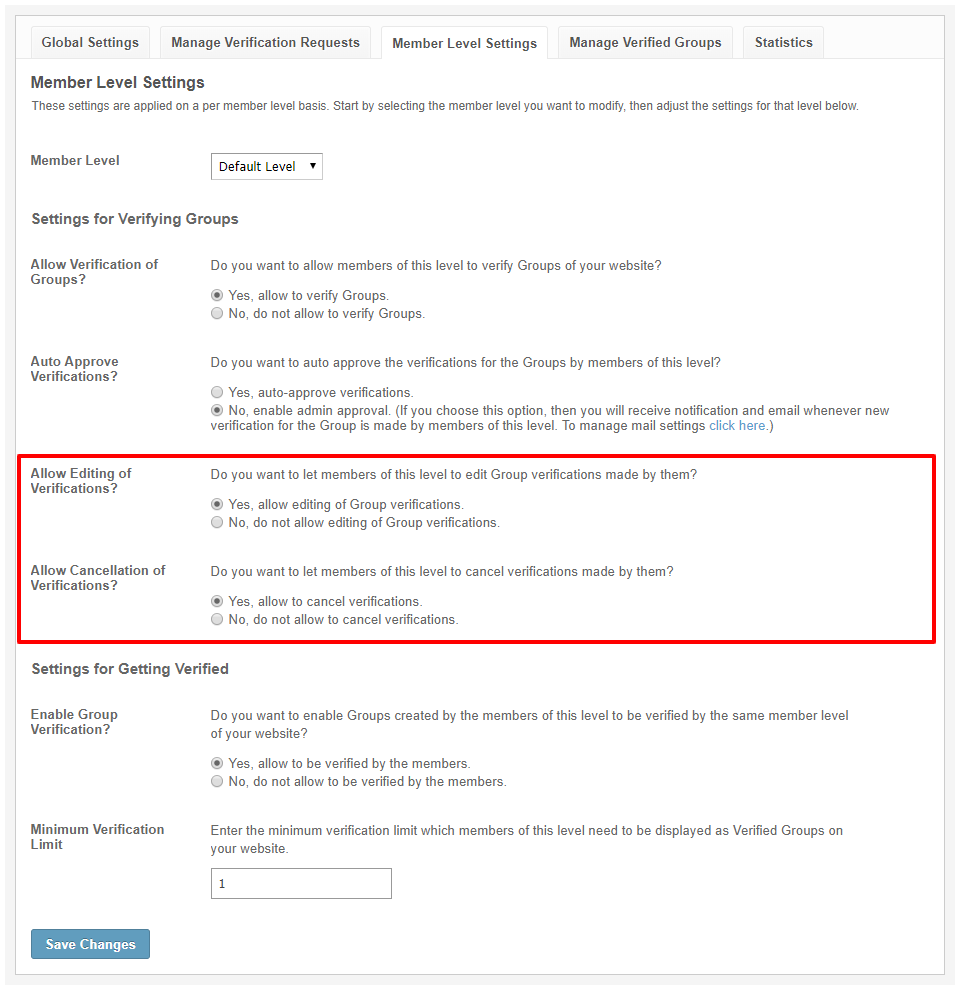 Allow Cancellation of VerificationsChoose to let members of any level to cancel verifications for the Groups made by them.