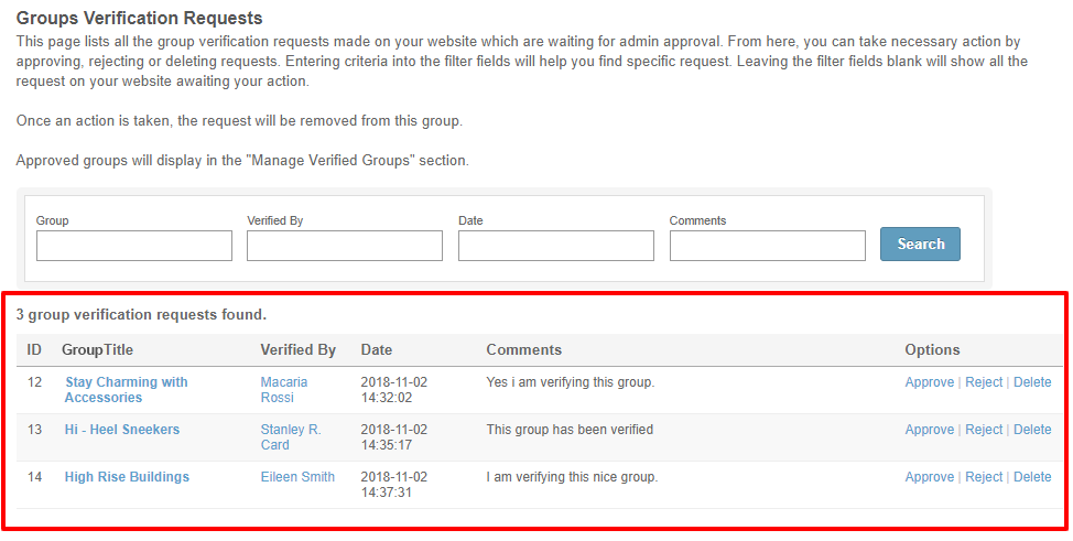 - “Manage Verification Requests” page in admin panel of this extension lists all the group verification requests made by members on your website.
