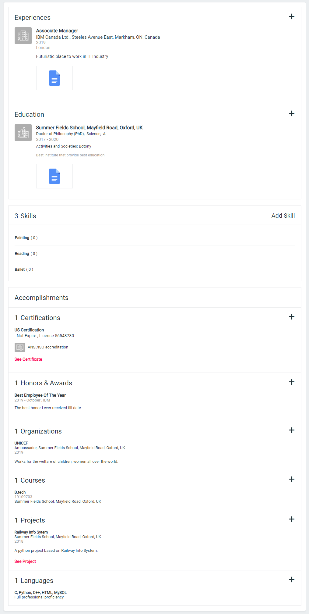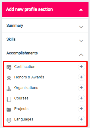Users can also add sub field details for the main Profile Fields like for Accomplishments user can further fill sub fields like Certifications, Honors & Awards, Organizations, Courses, Projects, Languages. These fields will help users to mention specifically & more clearly about their accomplishments in the particular field.