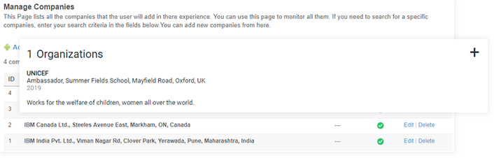 - This section lists all the companies that the user will add in the Experience field. Admin can also add companies manually.