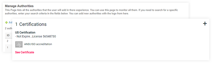 - This section lists all the Authorities that the user will add in the Certifications Profile field. Admin can also add authorities manually with logo for each authority.