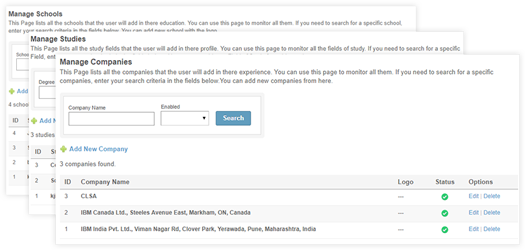 - Admin can manage entries for the Profile Fields such as Schools, Degrees, Field of Study, Positions, Companies, Authorities, Skills, Languages etc. from the Admin Panel.