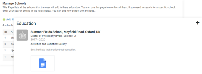 - This section lists all the schools that the user will add in the education field. Admin can also add schools manually with logo for each school.