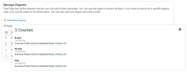 - This section lists all the Degrees that the user will add in the education field. Admin can also add degree names manually from this section.