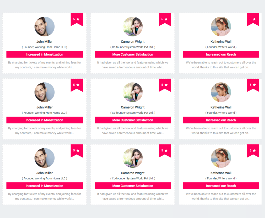 - Testimonial Showcase Plugin comes up with the unique 5 display designs including various Widgets, View page & Carousel Slider.