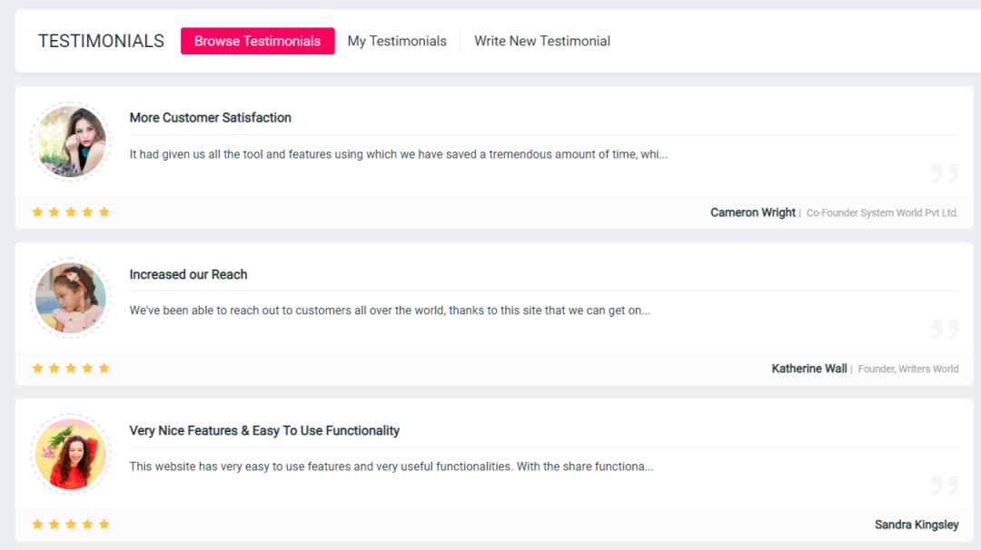 - All the testimonials created will be listed under Browse Testimonials section of your website.