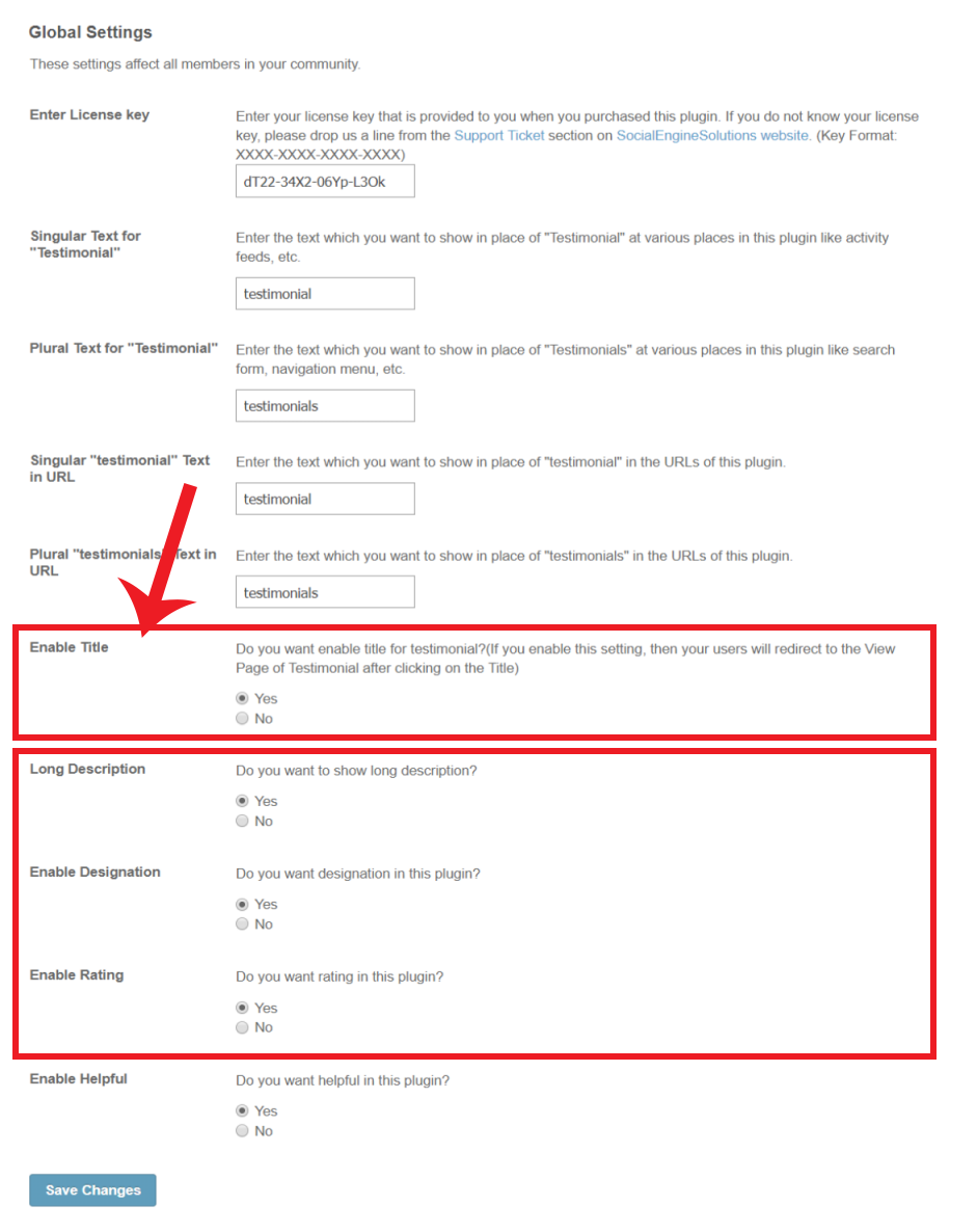 Global SettingsGlobal Settings allows you to enable various settings for the Testimonials such as Title / View Page, Long Description, Designation, Rating & Helpful settings for this Plugin.
