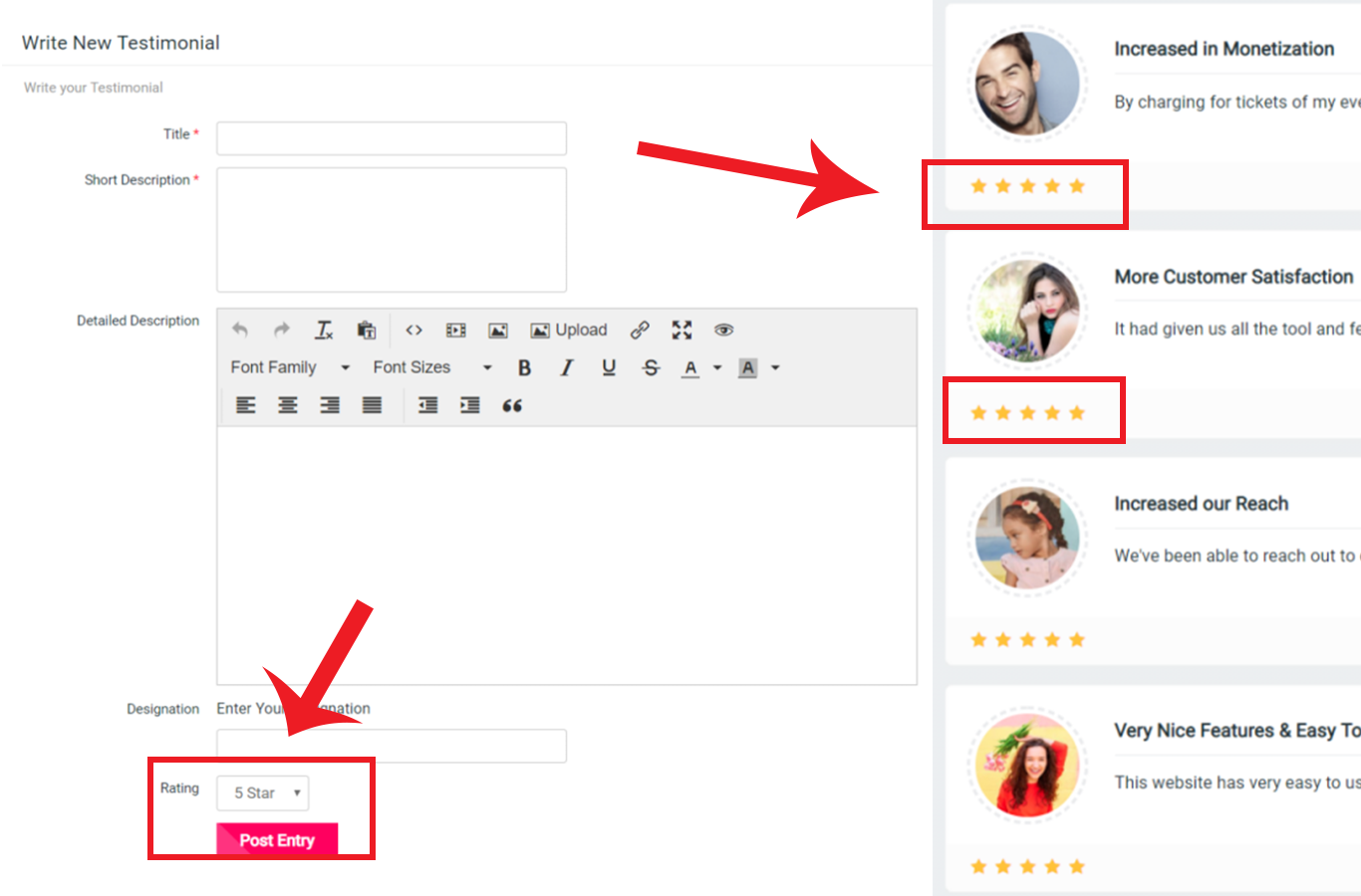 - With this Plugin, you and your website users are allowed to create numbers of Testimonials very easily.